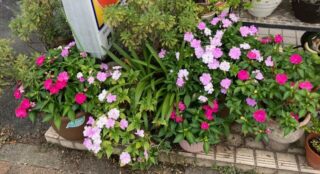 朝晩の最低気温が10度を割るようになり、店先のサンパチェンスの葉が黄色く変色し落ち始めます。そうなると室内に入れてあげないと枯れてしまいます。しかし、今年はドンドン増えてしまったので7鉢も店内に避難する置き場所がありません。